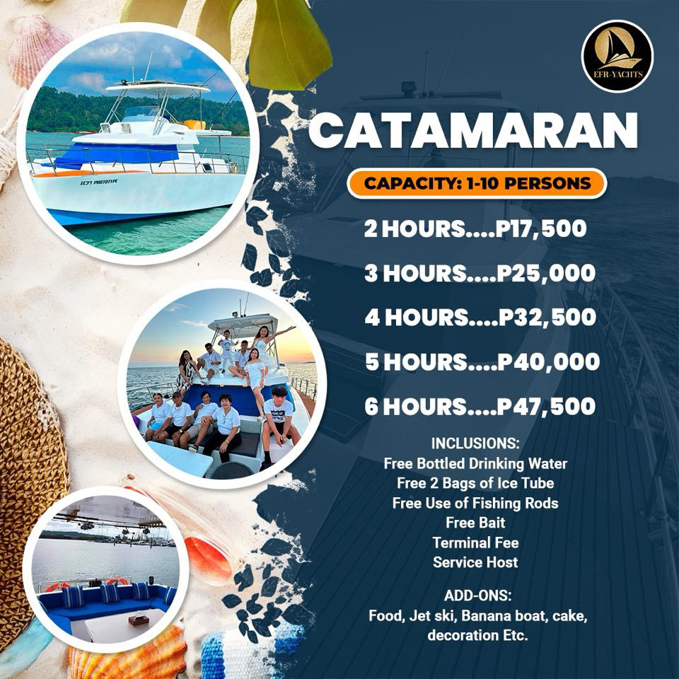 This catamaran blends adventure and relaxation, featuring quality fishing equipment for deep-sea fishing up to 350–500 meters. Its spacious, stable layout is perfect for family or barkada outings—whether for a sunset cruise, casual fishing, or simply enjoying time together at sea. Ideal for bonding and shared memories.